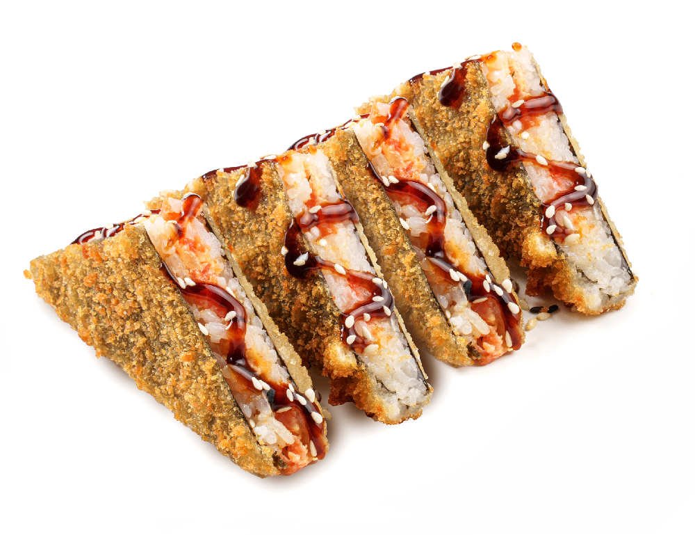 Состав: рис, нори, лосось, соус спайси,кляр,сухари, соус унаги, кунжут.