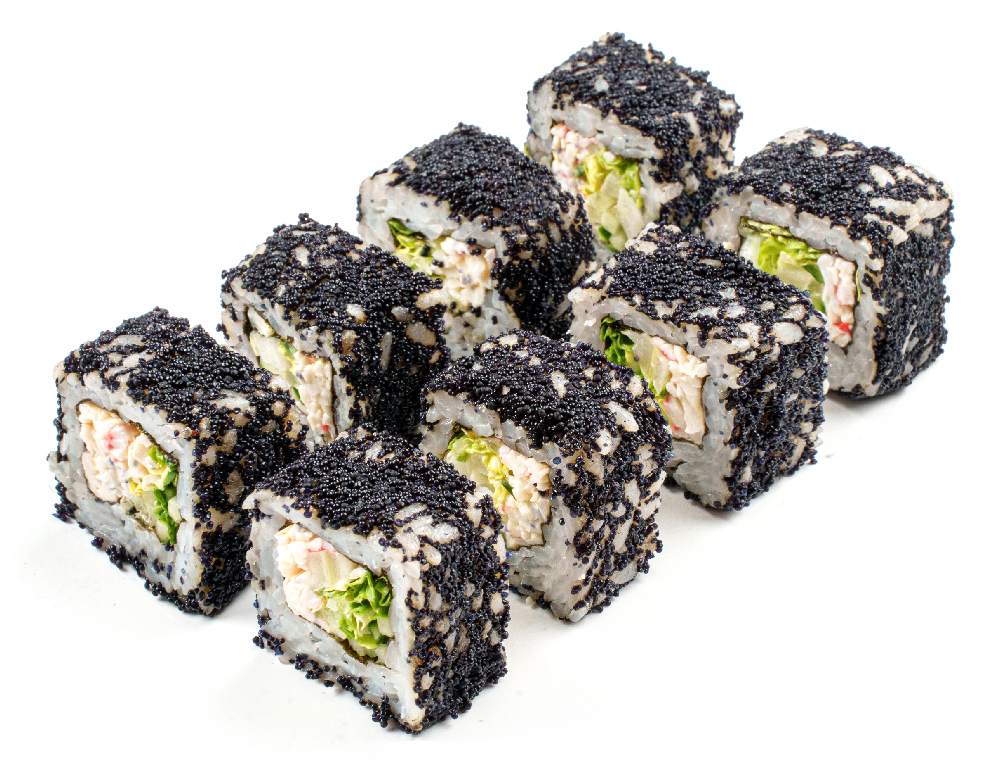 Состав: снежный краб, сливочный сыр, огурец, пекинская капуста, черная икра масаго,спайси соус, рис, нори.