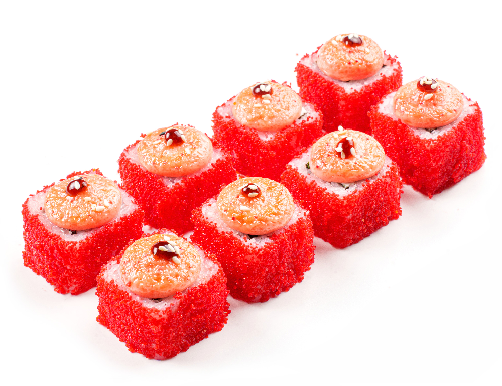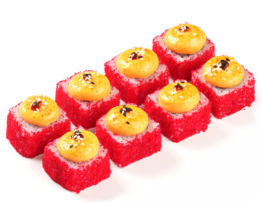 Состав: снежный краб, сливочный сыр, огурец, соус сырный, соус унаги, красная икра масаго, кунжут, рис, нори.