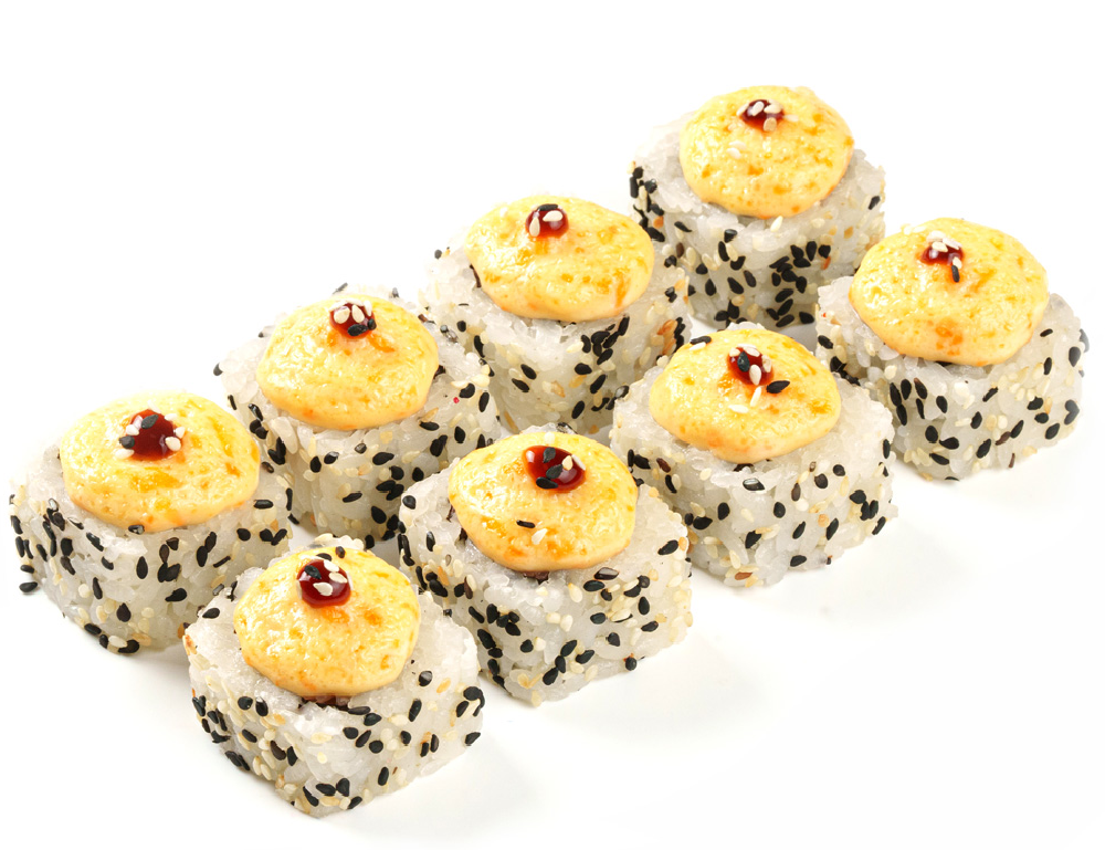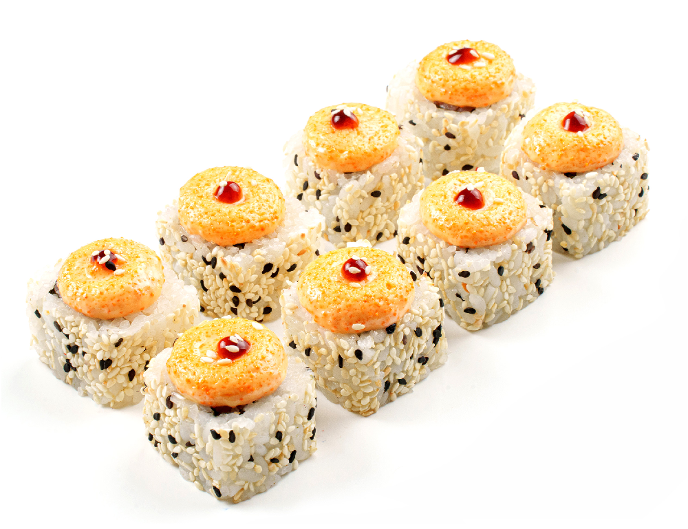 Состав: копченая курица, сливочный сыр, болгарский перец, кляр, сухари, соус унаги, кунжут, рис, нори.
