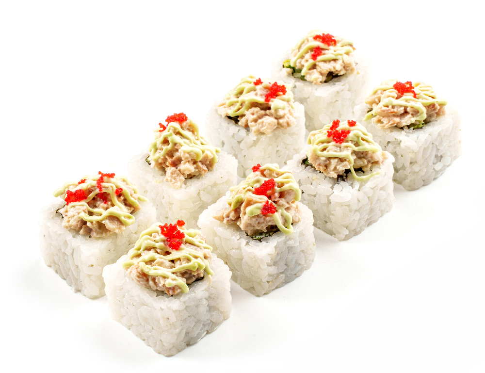 Состав: тунец, сливочный сыр, помидор, красная икра масаго, рис, нори.