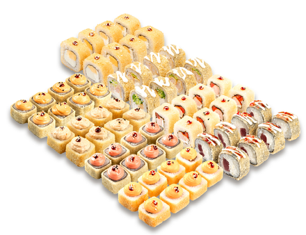 Встречайте гостей с сетом роллов с лососем, креветкой, кальмаром и морепродуктами