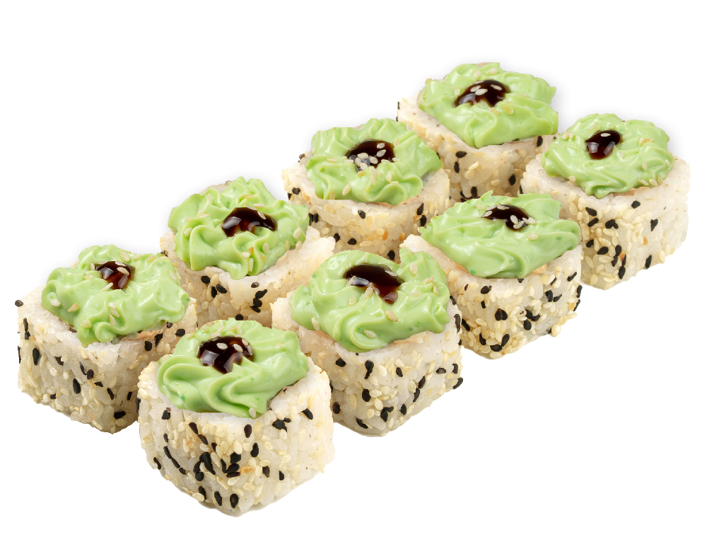 Состав: креветка в панировке, сливочный сыр, пекинская капуста, чесночный соус, соус унаги, кунжут, рис, нори.