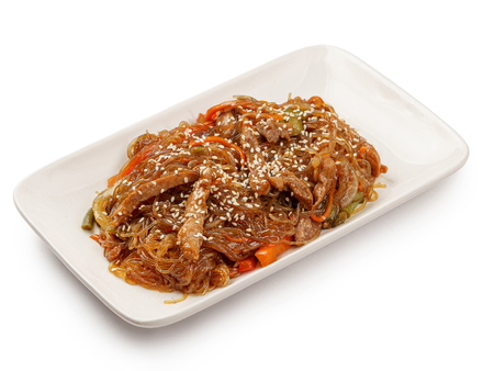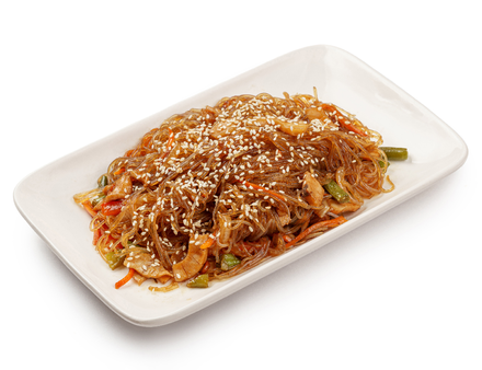 Стеклянная лапша фунчоза с кальмаром, овощами и фирменным сливочным соусом супреме