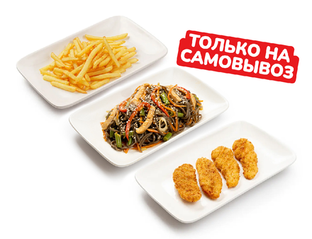 - закусками — картошка фри и по-деревенски, куриные наггетсы, луковые кольца, гренки, лапша вок, салат и другое.