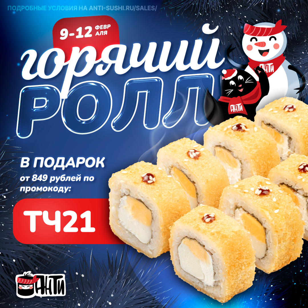 С понедельника по четверг к каждому заказу от 849 рублей в подарок аппетитный ролл Чизз темпура по промокоду ТЧ21