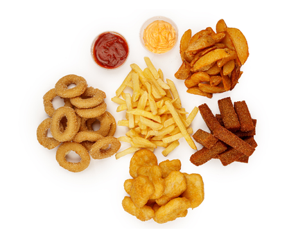 - закусками — картошка фри и по-деревенски, куриные наггетсы, луковые кольца, гренки, лапша вок, салат и другое.