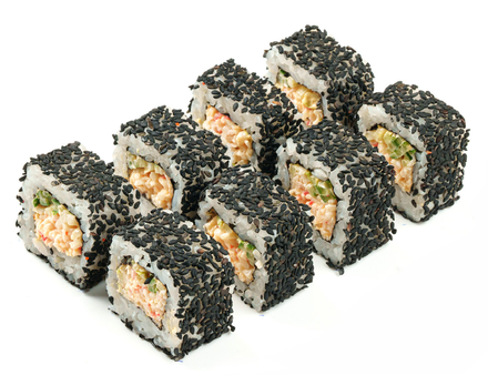 Нежный ролл с черным кунжутом, снежным крабом и под пряным соусом спайси ( 8 шт.)